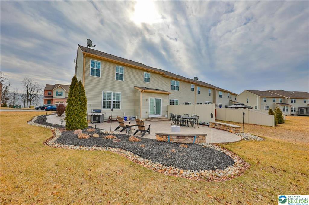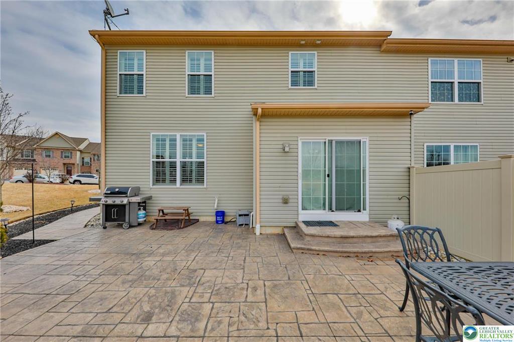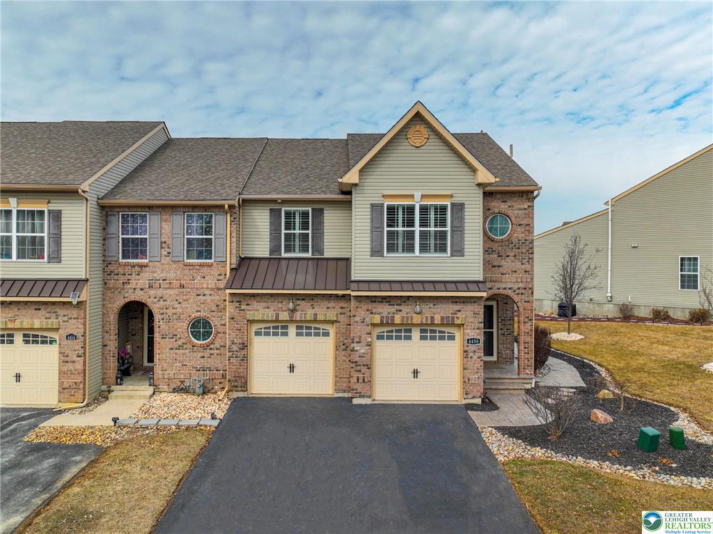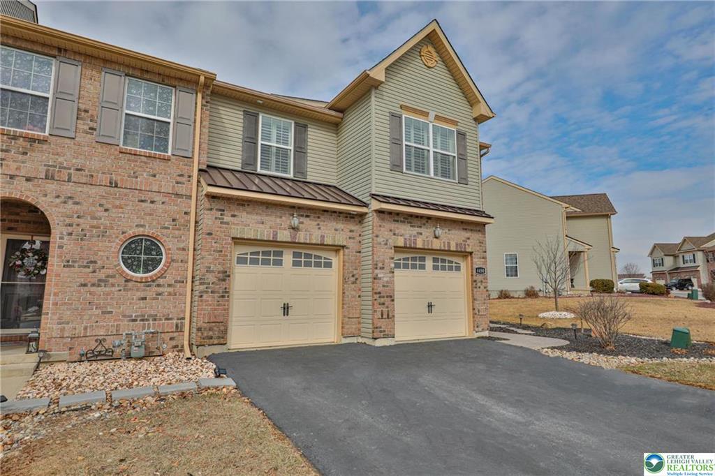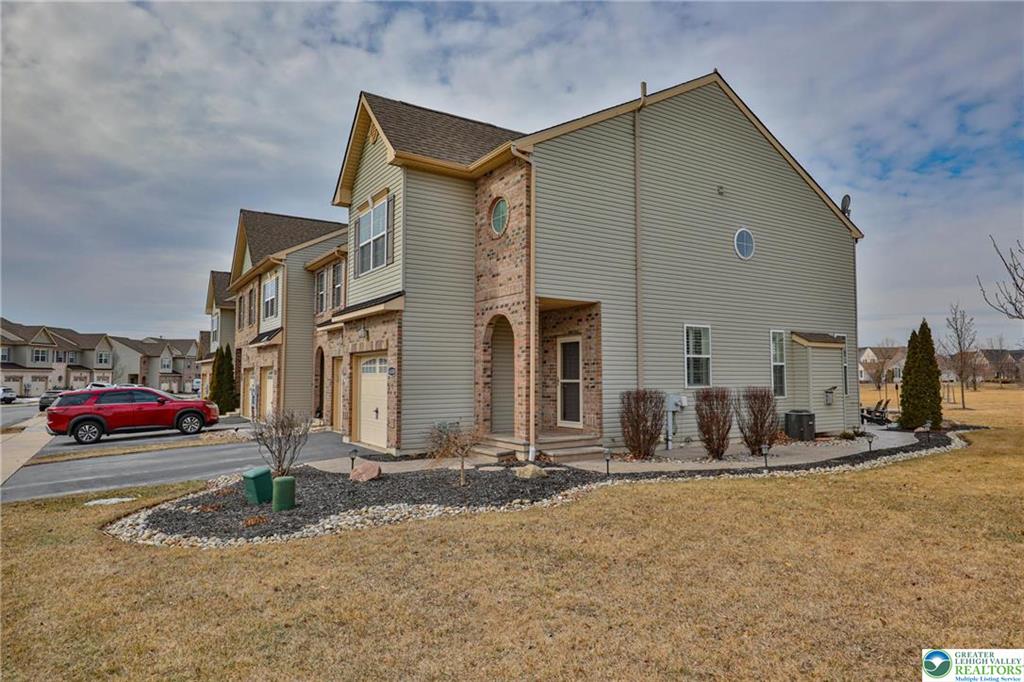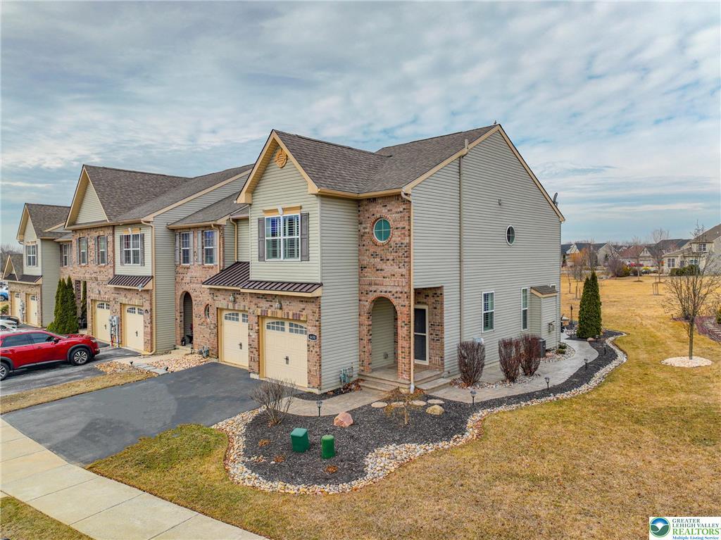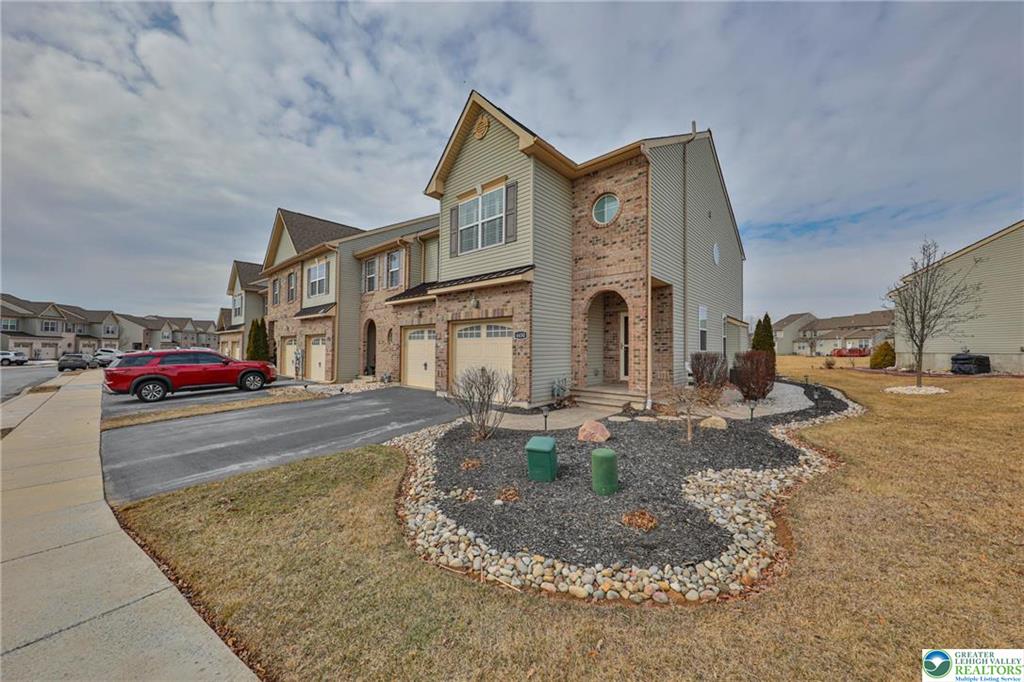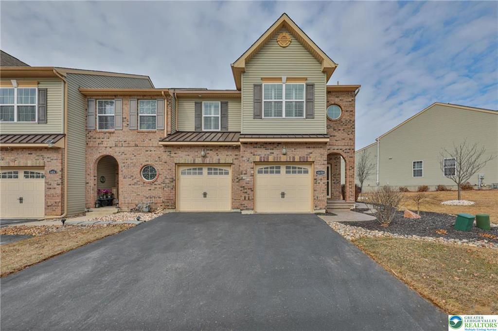 This Striking end unit townhome located in highly sought after Nazareth School District, is spotless and sophisticated, and delivers an impressive open concept designed for entertaining. A spacious foyer entry welcomes you, beautiful hardwood floors encompass most of the first floor, classy custom plantation blinds give that elevated look, and a sleek gas fireplace is an eye catching detail in the well sized family room. Modern tiled floor, granite counters and backsplash, 42" cabinets, oversized pantry, center island with breakfast bar, gas cooking, and stainless steel appliances make up the well appointed kitchen. The adjacent dining area has sliding doors that lead to a great back yard. Vaulted ceilings accent a primary bedroom oasis with its own luxurious en-suite which was just recently renovated and features tiled floors, dual vanity, soaking tub, step in shower, and large walk in closet. The roomy loft provides an excellent flexible space for many uses. The finished basement features a half bath, a second family room, another room for office or workout room and there is plenty of storage space. An elegant stamped concrete patio covers most of the back of the home and is perfect for relaxing and hosting BBQ's. Enjoy a convenient location with walking trails, park, and splash pad nearby, plus many shopping conveniences are within minutes. This well cared for home is move in ready, and you will be proud to call this place home.