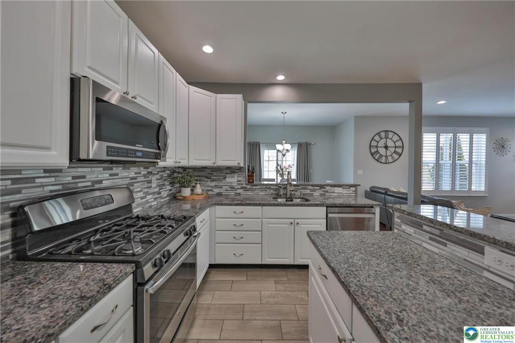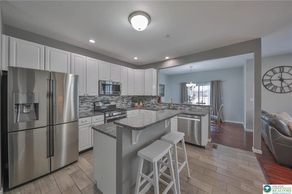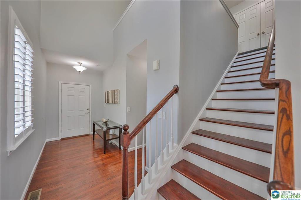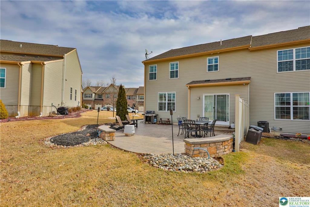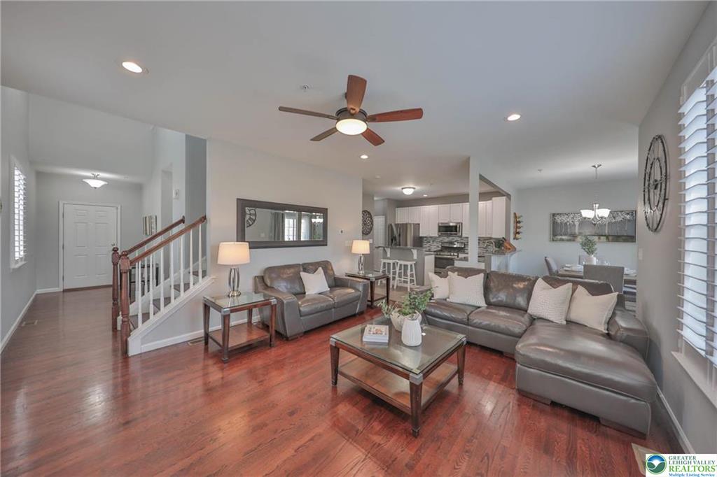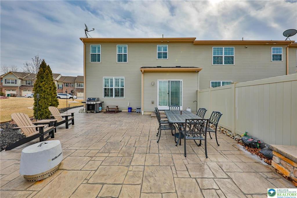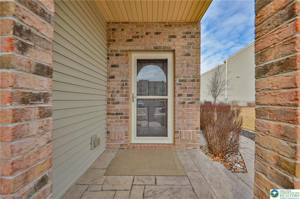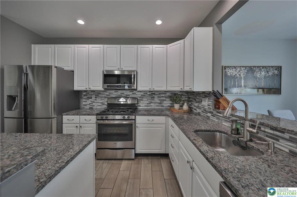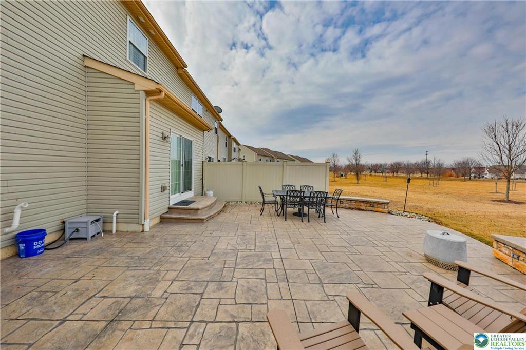 This Striking end unit townhome located in highly sought after Nazareth School District, is spotless and sophisticated, and delivers an impressive open concept designed for entertaining. A spacious foyer entry welcomes you, beautiful hardwood floors encompass most of the first floor, classy custom plantation blinds give that elevated look, and a sleek gas fireplace is an eye catching detail in the well sized family room. Modern tiled floor, granite counters and backsplash, 42" cabinets, oversized pantry, center island with breakfast bar, gas cooking, and stainless steel appliances make up the well appointed kitchen. The adjacent dining area has sliding doors that lead to a great back yard. Vaulted ceilings accent a primary bedroom oasis with its own luxurious en-suite which was just recently renovated and features tiled floors, dual vanity, soaking tub, step in shower, and large walk in closet. The roomy loft provides an excellent flexible space for many uses. The finished basement features a half bath, a second family room, another room for office or workout room and there is plenty of storage space. An elegant stamped concrete patio covers most of the back of the home and is perfect for relaxing and hosting BBQ's. Enjoy a convenient location with walking trails, park, and splash pad nearby, plus many shopping conveniences are within minutes. This well cared for home is move in ready, and you will be proud to call this place home.