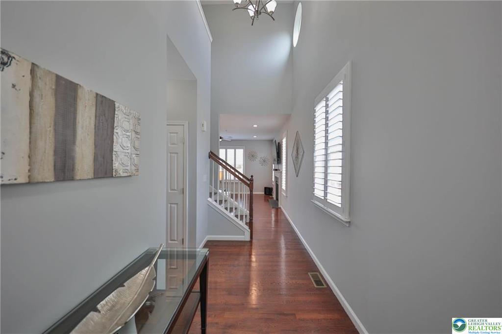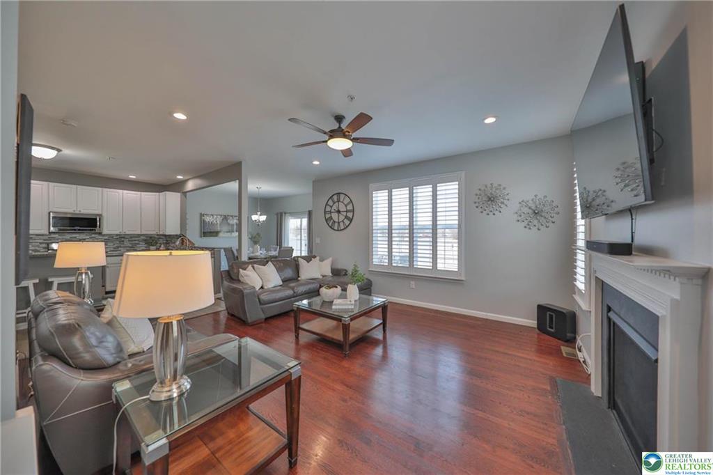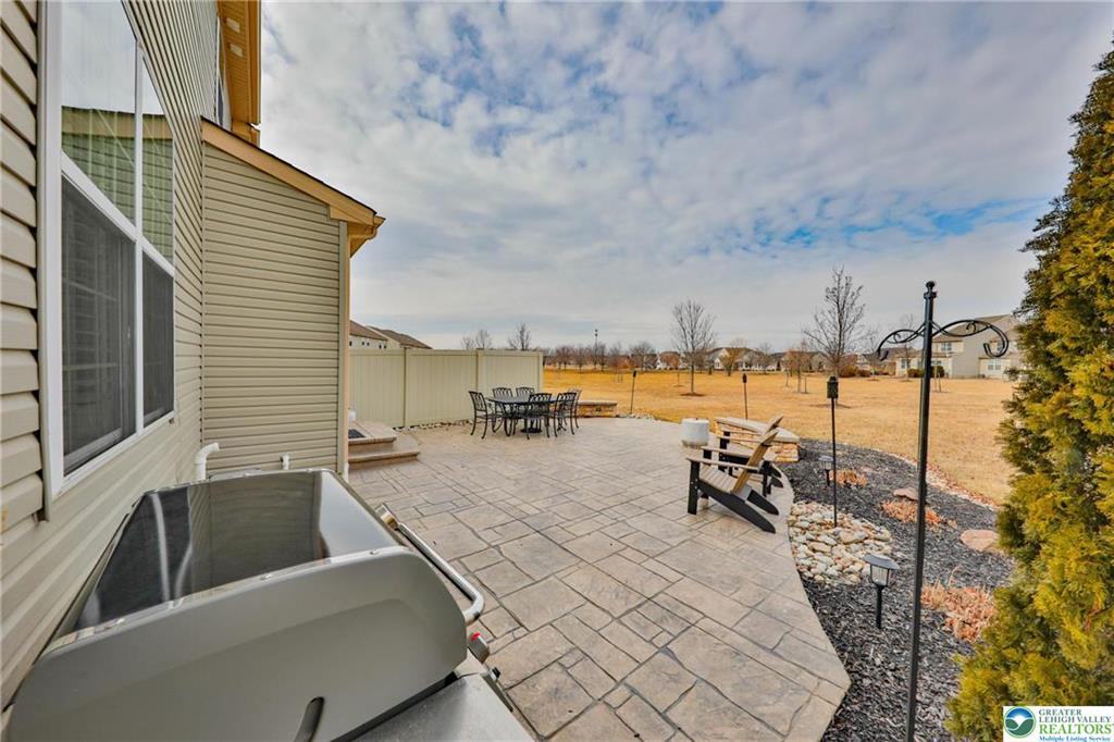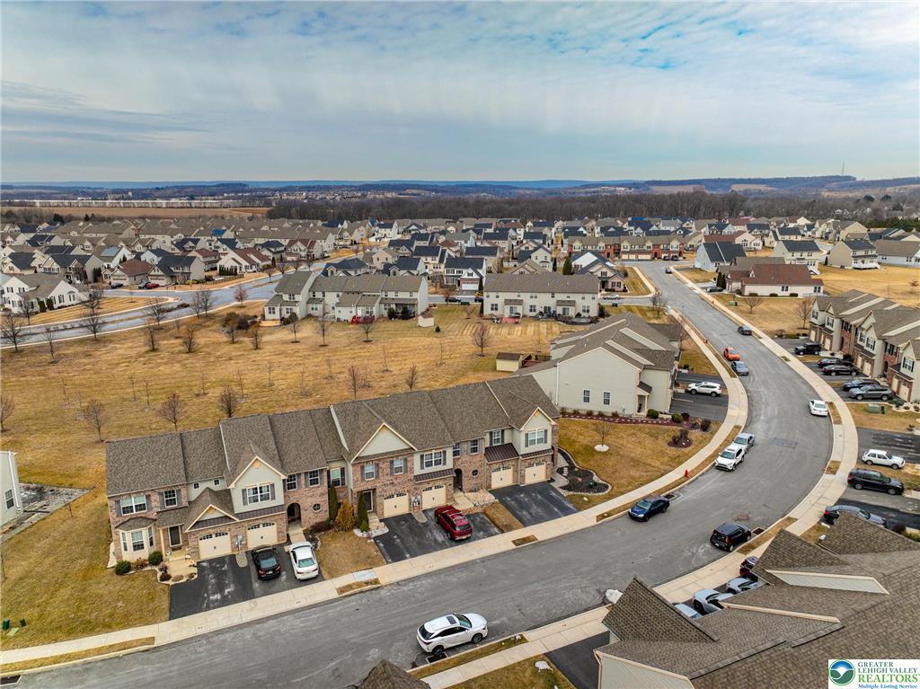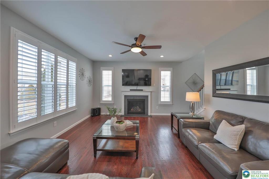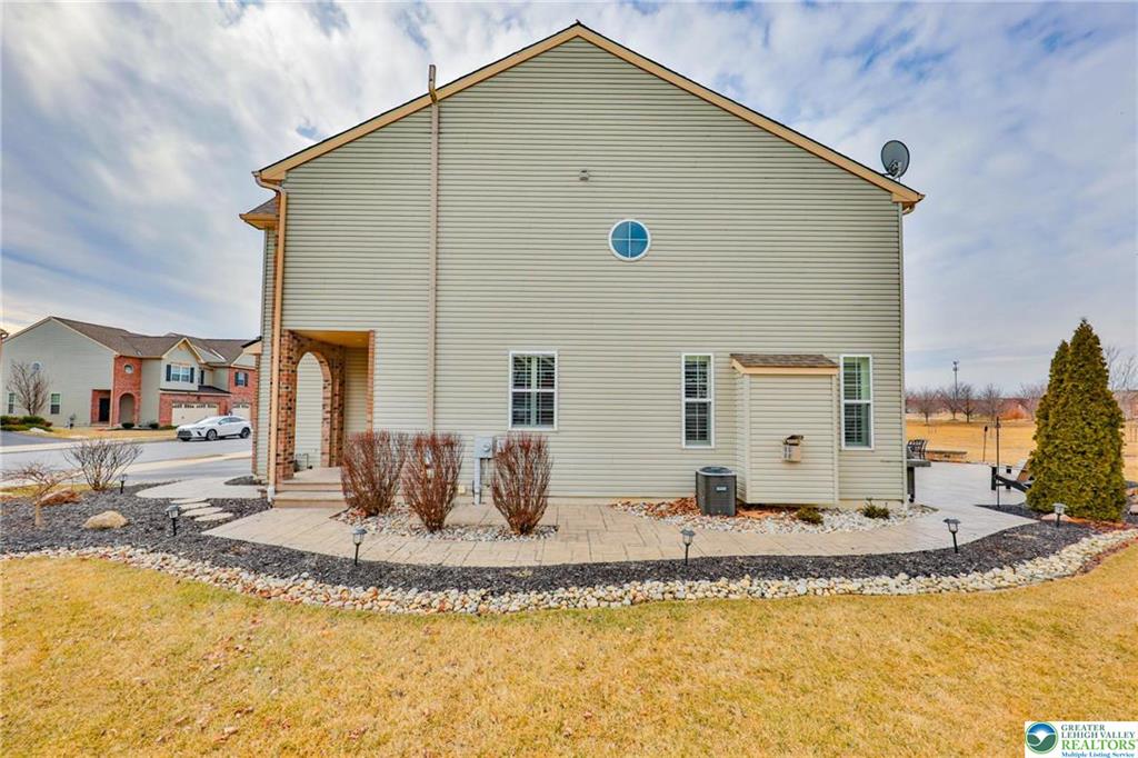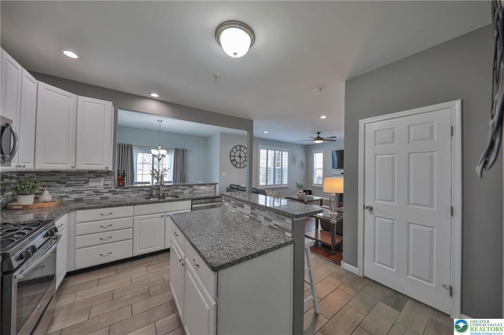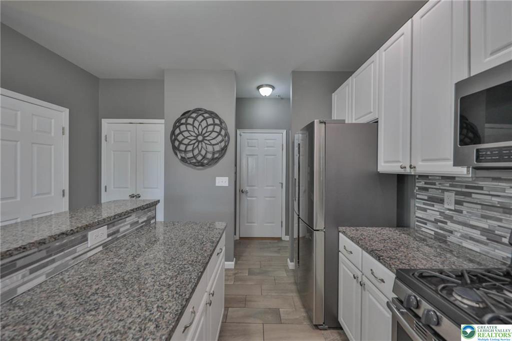 This Striking end unit townhome located in highly sought after Nazareth School District, is spotless and sophisticated, and delivers an impressive open concept designed for entertaining. A spacious foyer entry welcomes you, beautiful hardwood floors encompass most of the first floor, classy custom plantation blinds give that elevated look, and a sleek gas fireplace is an eye catching detail in the well sized family room. Modern tiled floor, granite counters and backsplash, 42" cabinets, oversized pantry, center island with breakfast bar, gas cooking, and stainless steel appliances make up the well appointed kitchen. The adjacent dining area has sliding doors that lead to a great back yard. Vaulted ceilings accent a primary bedroom oasis with its own luxurious en-suite which was just recently renovated and features tiled floors, dual vanity, soaking tub, step in shower, and large walk in closet. The roomy loft provides an excellent flexible space for many uses. The finished basement features a half bath, a second family room, another room for office or workout room and there is plenty of storage space. An elegant stamped concrete patio covers most of the back of the home and is perfect for relaxing and hosting BBQ's. Enjoy a convenient location with walking trails, park, and splash pad nearby, plus many shopping conveniences are within minutes. This well cared for home is move in ready, and you will be proud to call this place home.
