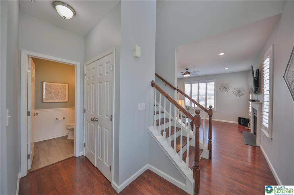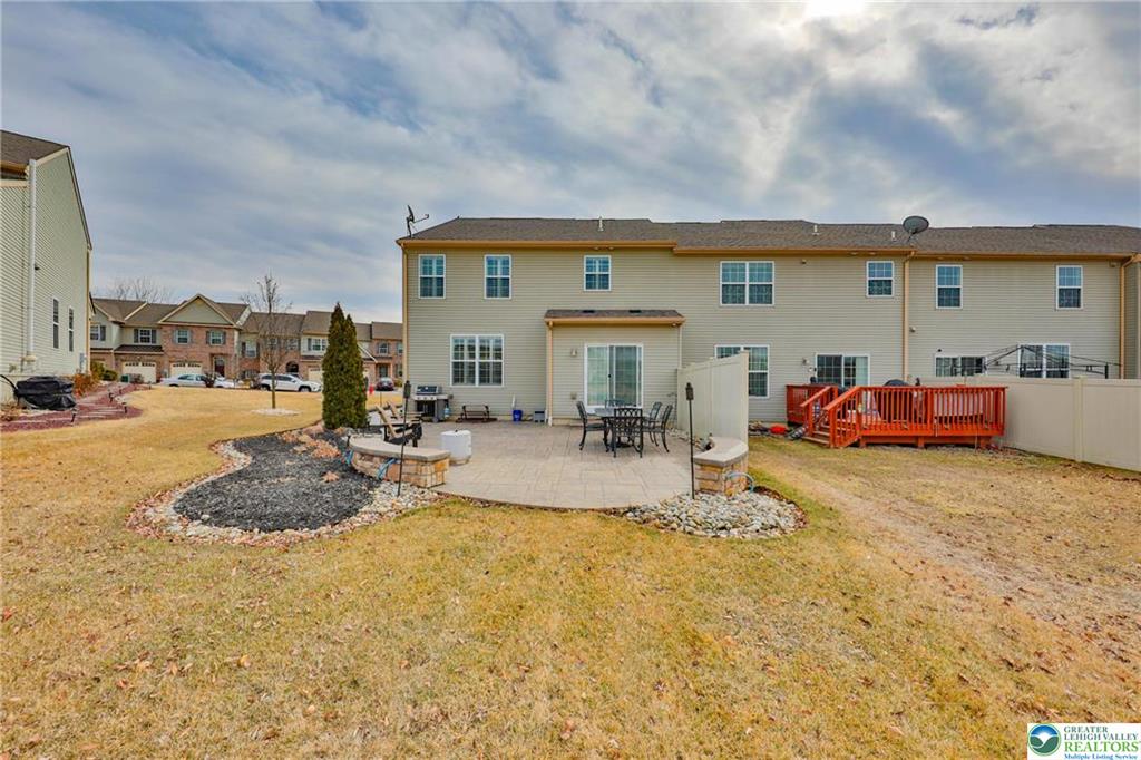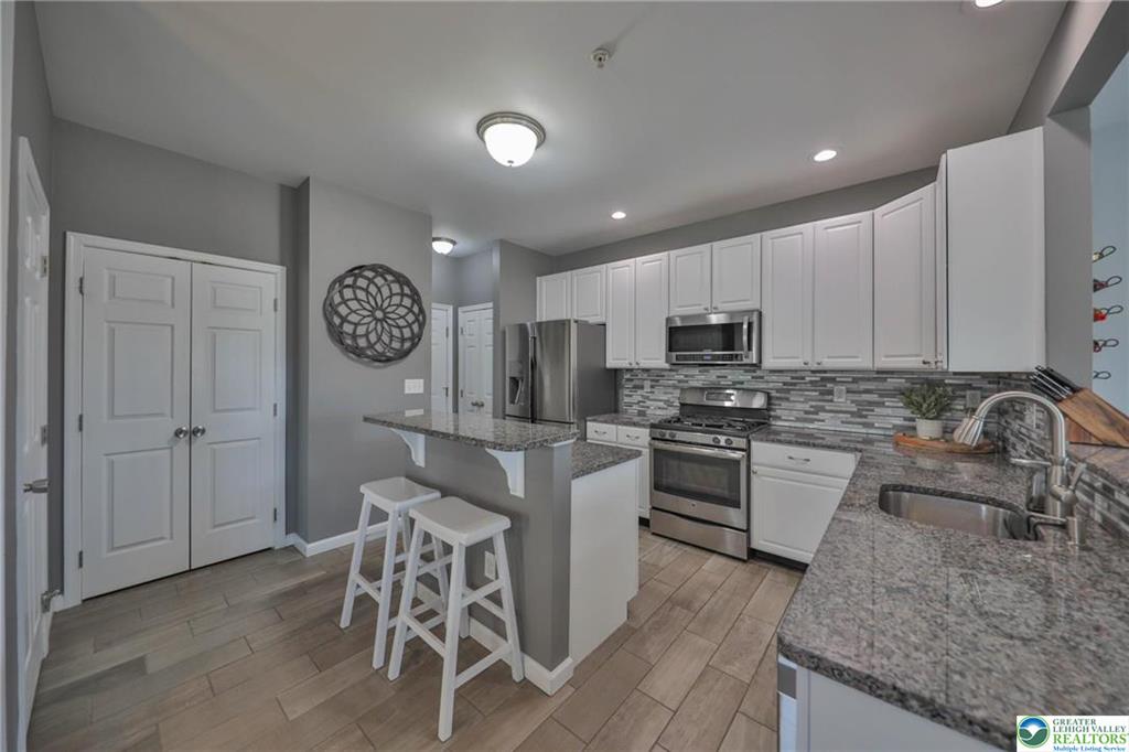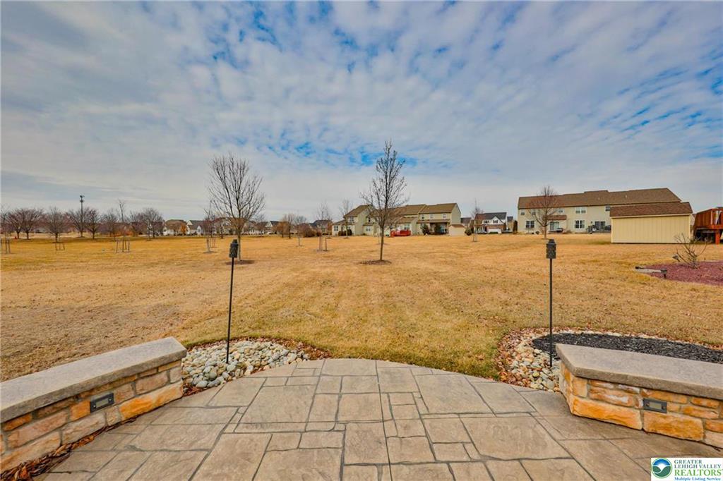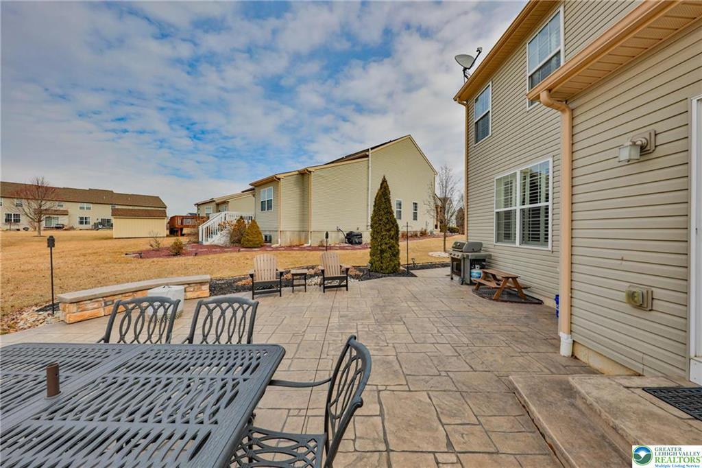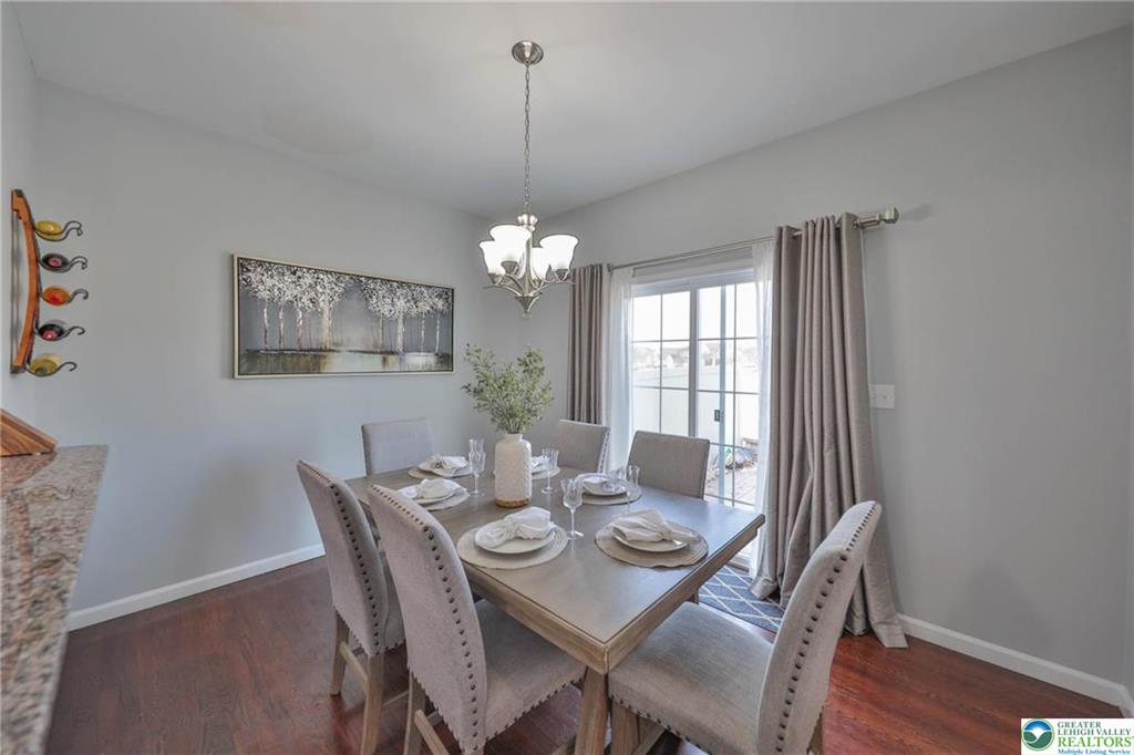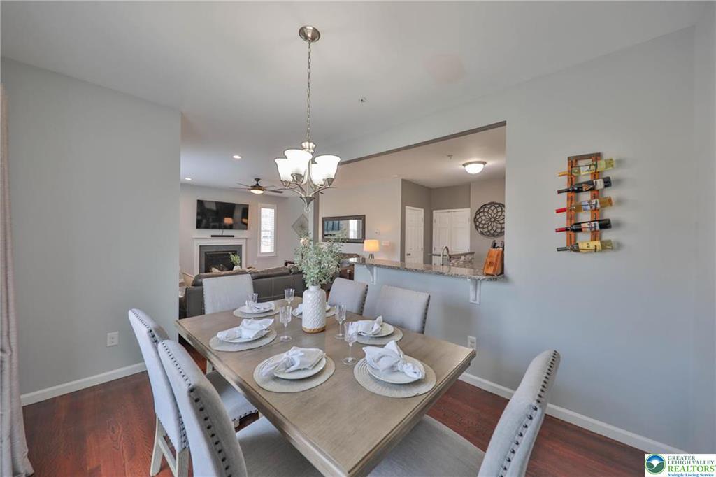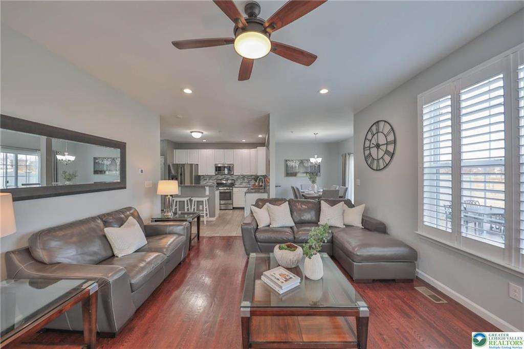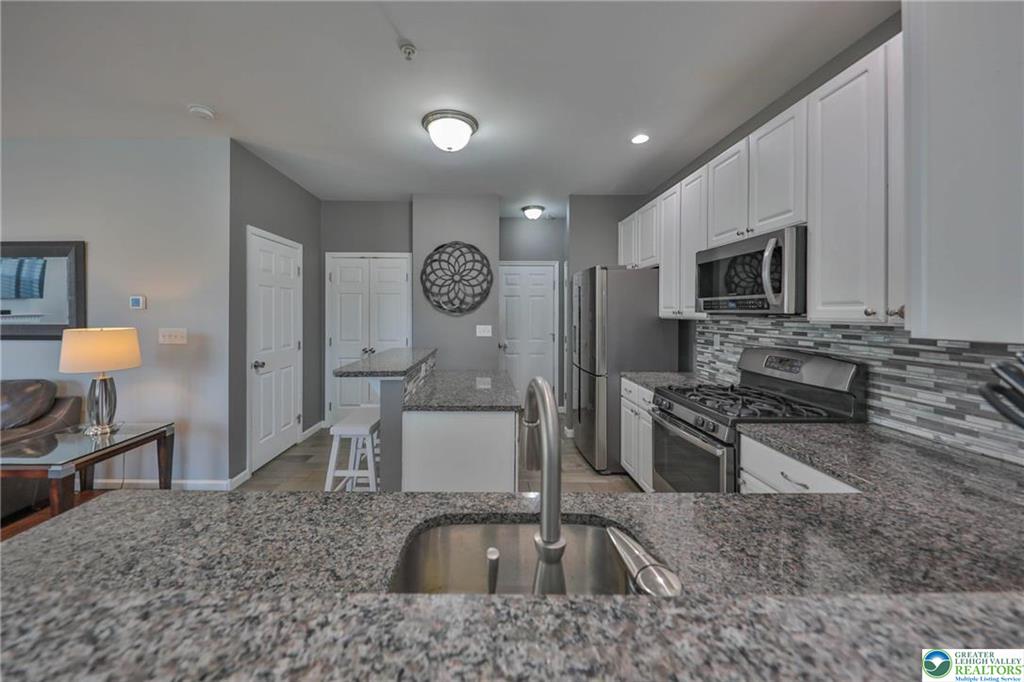 This Striking end unit townhome located in highly sought after Nazareth School District, is spotless and sophisticated, and delivers an impressive open concept designed for entertaining. A spacious foyer entry welcomes you, beautiful hardwood floors encompass most of the first floor, classy custom plantation blinds give that elevated look, and a sleek gas fireplace is an eye catching detail in the well sized family room. Modern tiled floor, granite counters and backsplash, 42" cabinets, oversized pantry, center island with breakfast bar, gas cooking, and stainless steel appliances make up the well appointed kitchen. The adjacent dining area has sliding doors that lead to a great back yard. Vaulted ceilings accent a primary bedroom oasis with its own luxurious en-suite which was just recently renovated and features tiled floors, dual vanity, soaking tub, step in shower, and large walk in closet. The roomy loft provides an excellent flexible space for many uses. The finished basement features a half bath, a second family room, another room for office or workout room and there is plenty of storage space. An elegant stamped concrete patio covers most of the back of the home and is perfect for relaxing and hosting BBQ's. Enjoy a convenient location with walking trails, park, and splash pad nearby, plus many shopping conveniences are within minutes. This well cared for home is move in ready, and you will be proud to call this place home.