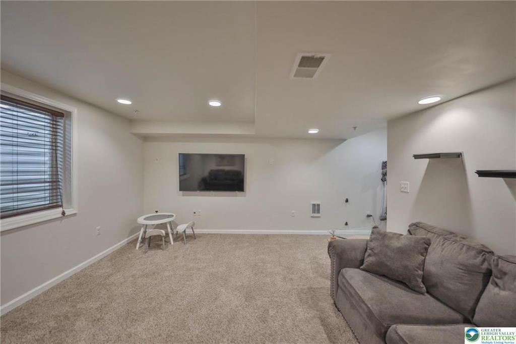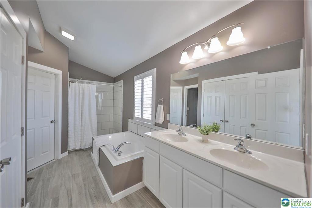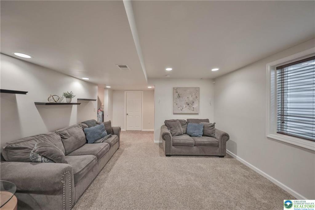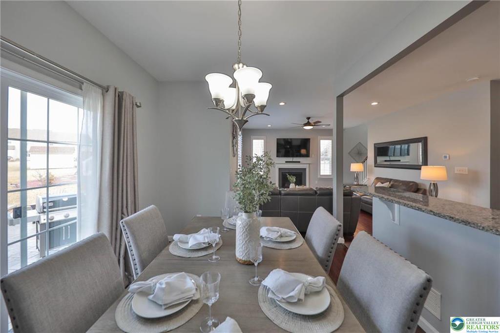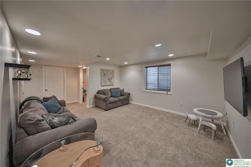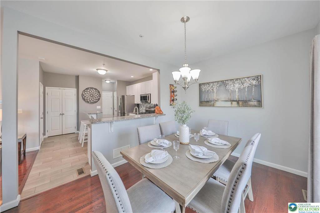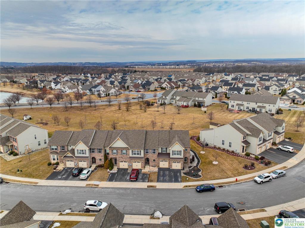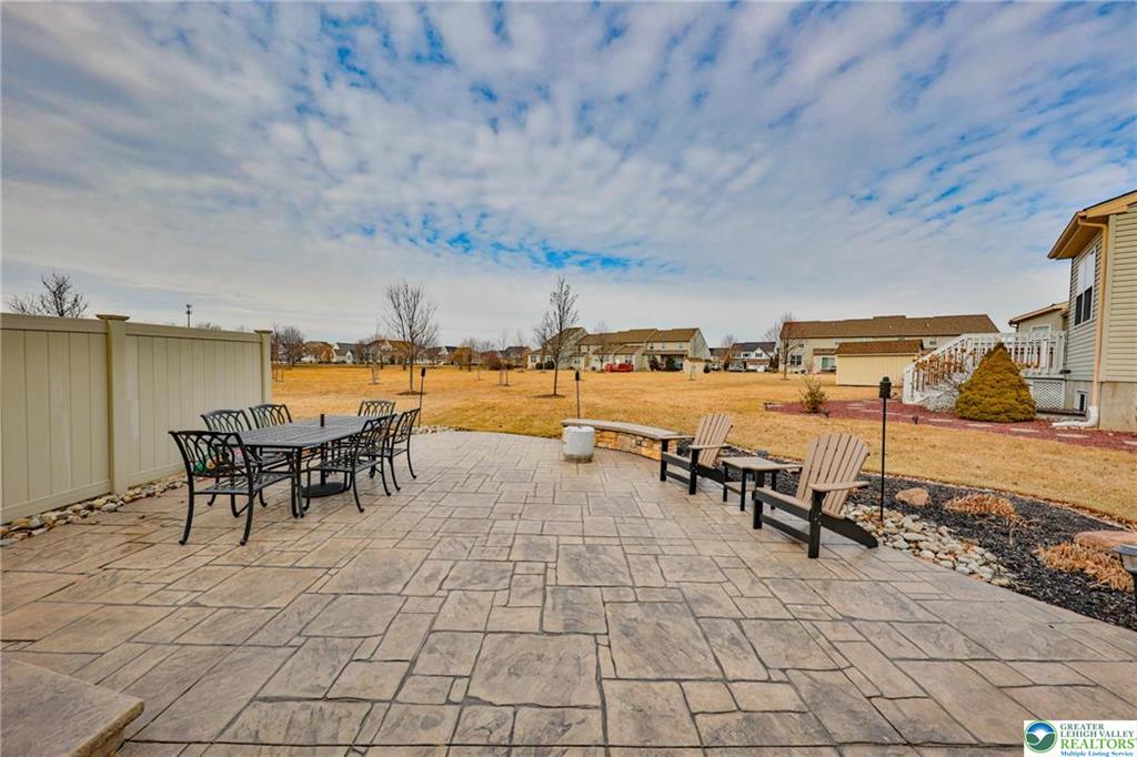 This Striking end unit townhome located in highly sought after Nazareth School District, is spotless and sophisticated, and delivers an impressive open concept designed for entertaining. A spacious foyer entry welcomes you, beautiful hardwood floors encompass most of the first floor, classy custom plantation blinds give that elevated look, and a sleek gas fireplace is an eye catching detail in the well sized family room. Modern tiled floor, granite counters and backsplash, 42" cabinets, oversized pantry, center island with breakfast bar, gas cooking, and stainless steel appliances make up the well appointed kitchen. The adjacent dining area has sliding doors that lead to a great back yard. Vaulted ceilings accent a primary bedroom oasis with its own luxurious en-suite which was just recently renovated and features tiled floors, dual vanity, soaking tub, step in shower, and large walk in closet. The roomy loft provides an excellent flexible space for many uses. The finished basement features a half bath, a second family room, another room for office or workout room and there is plenty of storage space. An elegant stamped concrete patio covers most of the back of the home and is perfect for relaxing and hosting BBQ's. Enjoy a convenient location with walking trails, park, and splash pad nearby, plus many shopping conveniences are within minutes. This well cared for home is move in ready, and you will be proud to call this place home.